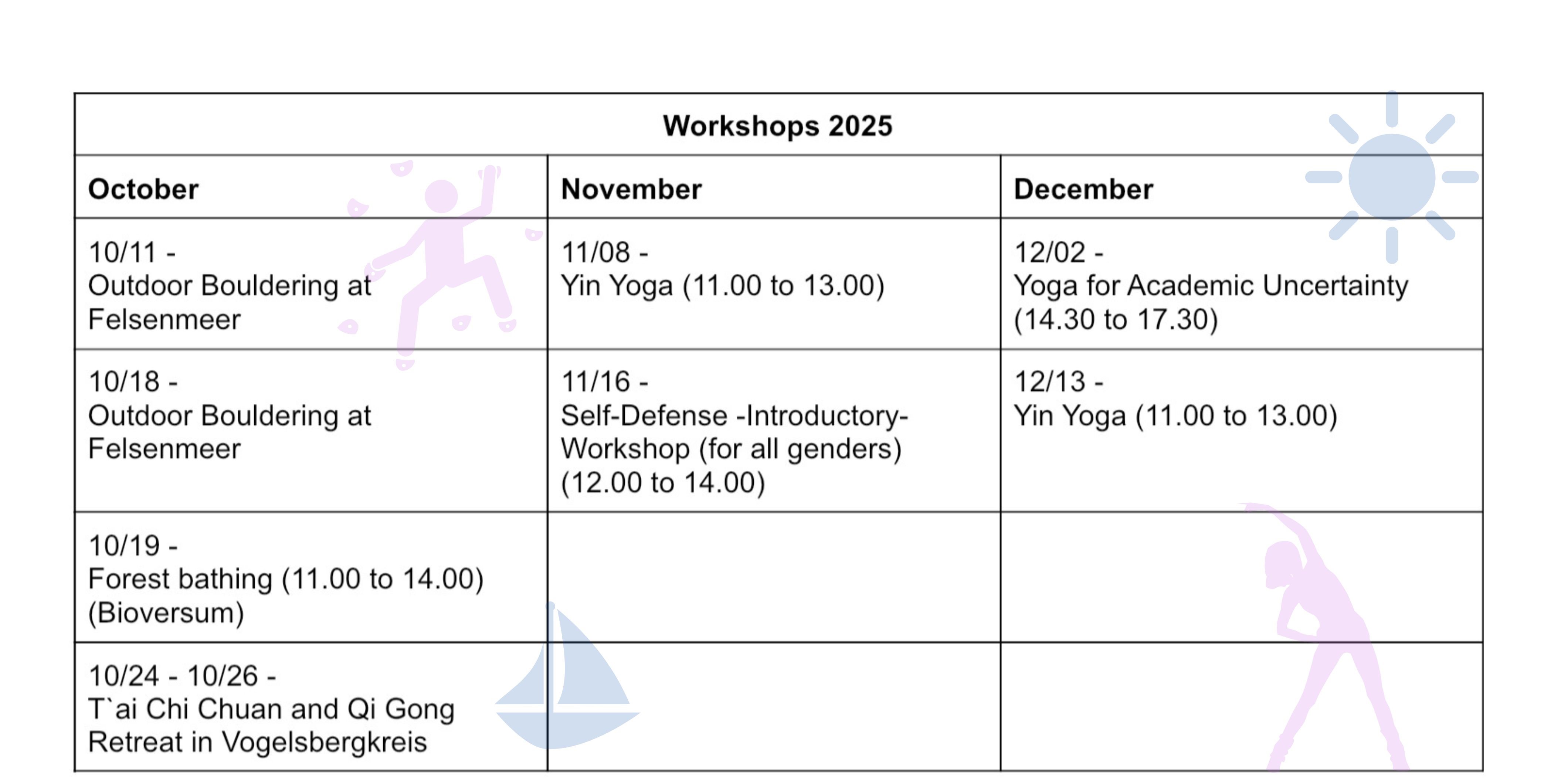 Description: Welcome to a yoga class that offers a harmonious fusion of Hatha and Vinyasa with elements of Restorative Yoga. In this class we will practice asanas (postures) to build strength and promote flexibility while emphasizing the flow of breath to create a connection between body and mind. By combining strength-building, flowing movements and calm, restorative poses, we will create a balanced practice that guides the mind and body into a state of clarity and calm. For students in particular, yoga offers an effective way to alleviate the stresses of desk work by strengthening the spine, reducing shortening as well as stress and therefore having a positive impact on everyday life. Whether you are new to yoga or want to deepen your practice, this class offers a supportive and non-judgmental space for all levels. Weather permitting, outdoor yoga can be offered as an option. Instruction in English is also available. Prerequisite: Preferably bring your own yoga mat if you have one. (There will be spare mats)